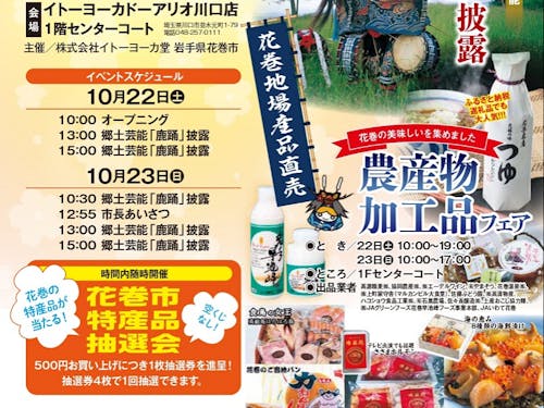 2022/10/2110月22日・23日の2日間、埼玉県川口市のイトーヨーカドーアリオ川口店にて、「花巻市フェア」を開催します。 花巻の美味しいものを集めた農産物加工品フェアでの花巻地場産品の直売や郷土芸能「鹿踊(ししおどり)」の披露、移住定住相談・ふるさと納税ブースを設置し、花巻をより身近に感じていただけるイベントとなっております。 当日のお買い上げの際にもらえる抽選券を集めると、花巻の特産品が当たる抽選会にも参加できます! お近くにお住まいの方はぜひ足を運んでみてください。 【開催日】2022年10月22日(土)、23日(日) 【開催時間】22日(土)10:0019:00 23日(日)10:0017:00 【会場】イトーヨーカドーアリオ川口店 1階センターコート(埼玉県川口市並木元町1-79)