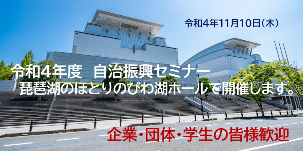 2022/11/0911月10日 滋賀県が誇る劇場びわ湖ホールにおいて「自治振興セミナー」を開催します。本セミナーは、もともと地方公共団体の職員及び議会議員の政策形成能力,法務能力の向上を図ることを目的として毎年全国各地で開催されているものです。少し堅い内容と思われるかもしれませんが、行政関係者だけでなく、これからの社会やまちづくりに関心をもっておられる企業や団体等の皆様、学生の皆様にも是非聴講いただきたい内容にしております。 セミナーでは三日月知事と3名の講師をお迎えし、「未来を拓く地方創生」をテーマとしてご講演いただきます。 滋賀県での開催は9年ぶりと貴重な機会ですので、是非琵琶湖のほとりの美しい会場にお越しください! ☆オンライン配信・見逃し配信も実施予定ですので、そちらもぜひご利用ください。