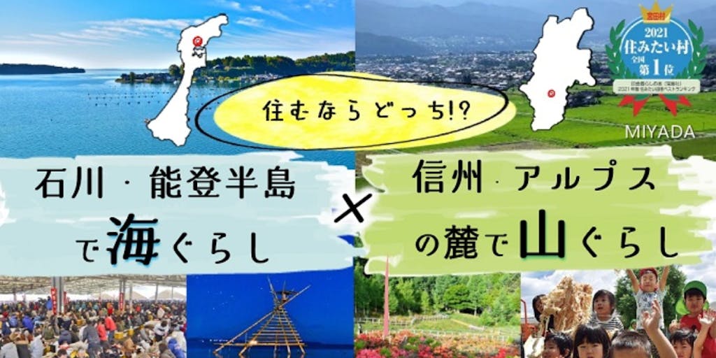 宮田村と災害時相互応援協定を結ぶ石川県穴水町と合同移住セミナーを初めて開催します! 移住を考えるときに、海暮らしと山暮らしのどちらもいいと悩んでいる人はいませんか? 今回はそんな方たちのために、まったく違う二つの町村の両方の暮らし方を知っていただけるセミナーを企画しました。 海と山の暮らしをいろいろな角度から比較しながら移住について考えてみるのはいかがでしょう? 当日は簡単なゲームを行いながら、海と山の暮らしの違いや魅力、メリット、デメリットをお伝えしたいと思います。ゲームでは特産品をプレゼント。 都会からUターンした若い移住相談員や8年目を迎えるベテラン移住相談員が何でも相談に乗ります。 お気軽にご参加下さい!