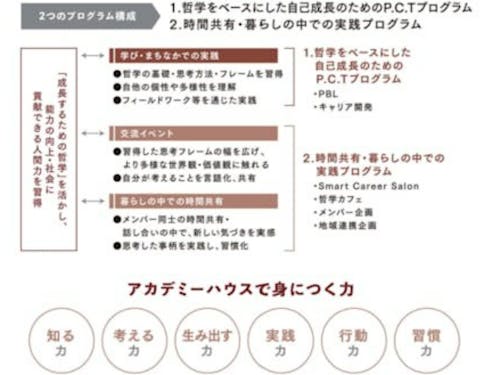 物事の変化が加速していく、これからの時代。ここ山口で、予測できない事柄や社会情勢に立ち向かえる次世代のリーダーを育むため、本施設の独自プログラムである、哲学をベースとした時間共有型のキャリア開発「P.C.Tプログラム(Philosophy-based Career Development Through Time Sharing)」を提供します。 日々の共同生活や定例イベント・交流会の企画・開催等による他者・地域との共生・関わり、専門家がバックアップする「PBL(Project Based Learning)/課題解決型学習」やキャリア開発プログラム等を通して、哲学的思考や多様性の尊重など、様々な経験やスキルの獲得を目指し、自己肯定感・自己効力感を高め、人間性を育み、人生の充実につなげていきます。