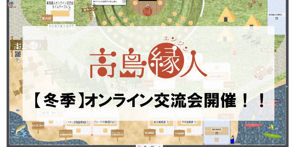 2022/12/0312月2日、3日(金、土)開催の高島縁人オンライン交流会の申込受付を開始しました! 10月に開催しました、秋季オンライン交流会がさらにパワーアップ! 高島市を模したバーチャル空間で、市の魅力を伝える交流会イベントを開催いたします! 市の職員や地域団体・企業などによる出展ブースやステージ発表などが催されます。 くわしい情報は決定し次第、随時更新していきます。高島市内の全国どこからでもお気軽に、ご自宅のパソコンからバーチャルな高島を覗きに来てください。