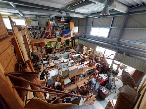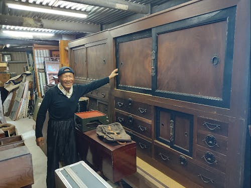 ■隣の倉庫がやばい!珍しい骨董が数万点!宝の山やー! 「隠れ宿 弥助」に隣接するガレージには、橋掛さんが50年以上かけてコレクションしてきた骨董品が沢山!欄間、古箪笥、壺、籠、重箱、絵画…と、古き良き時代の日本のカルチャーが感じられる夢のお宝で埋め尽くされています!その数はガレージに収まりきらず、数か所に分けて保管しており、定期的に買いつけに来られるマニアのお客様もいらっしゃるとか。「昭和レトロ」や「大正ロマン」がエモい!と、Z世代の若者を魅了し再ブームとなっている近年、ネット通販で国内外に広く販売できれば、佐川町で理想とする古民家生活を実現するための貴重な資金源になること間違いなし?!