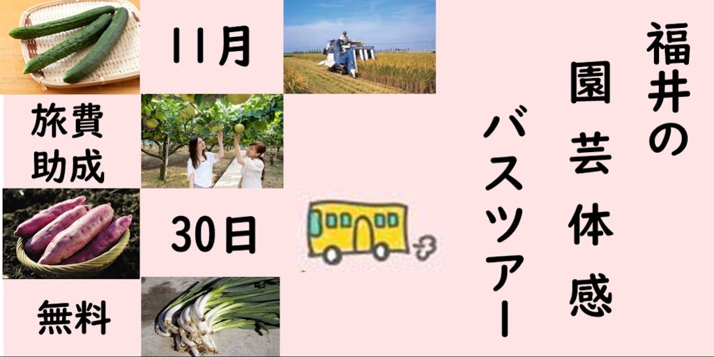 ・定員:20名 ・解散場所:JR敦賀駅 ・スケジュール: 10:00 【集合】JR芦原温泉駅 10:30 坂井北部丘陵地の園芸産地見学 ・(株)フィールドワークス ・(株)松浦ファーム 12:10 ふくい園芸カレッジ(昼食) ・園芸カレッジの見学・作業体験 ・NPO法人 ピアファーム(説明) (移動) 15:30 嶺南地域の施設園芸、Iターン就農見学 ・キュウリ農家(敦賀市) ・Iターン就農者(美浜町) 17:10 【解散】JR敦賀駅