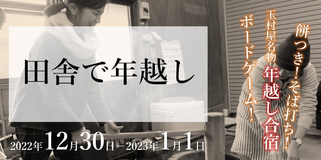 ・定員:5名 ・解散場所:地域まるっと体感宿 玉村屋 ・スケジュール: 【 12月30日(金)】 ※前泊(別途料金)のご希望も承ります。 8:30 JR今庄駅集合 午前 餅つき 午後 ボードゲームや町内観光(町内おもしろい人訪問)