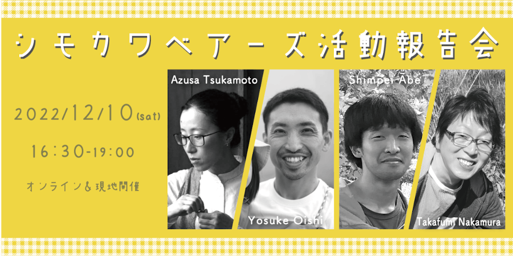 活動報告会はオンライン(Zoom)でも開催します。 当日足を運べない人でも、シモカワベアーズの取組みに興味のある方や、ローカル起業を考えている方、来年度のシモカワベアーズへの応募を検討している方はぜひご参加ください。