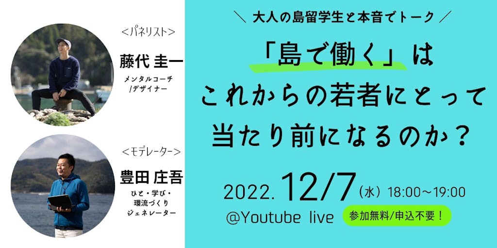 今回は、現在島で働いている現役「大人の島留学生」2名と、モデレーターに現在海士町役場で若者の還流おこしプロジェクトに従事している豊田庄吾さん、パネリストにしつもんメンタルトレーニングコーチの藤代圭一さんを迎えたトークイベントを開催します!