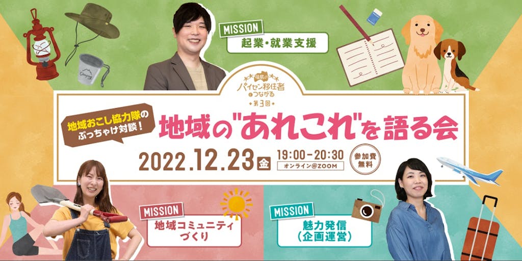 2022/12/23【福島県田村市オンライントークセッション】 生活のこと、お金のこと、自分のやりたいことができるのか。現役だからこそ話せる、地域おこし協力隊のホントのところ! 「地域おこし協力隊」に興味はあるけど、何をしている人たちなの?地域の人たちとなじめる?などの質問に、現役地域おこし協力隊がお答えするオンライントークイベントを開催します! 田舎で地域のために働きたい!地方で新しいことにチャレンジしたい!という方必見です!!