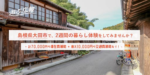 【計7万円の滞在費補助と最大1万円の交通費補助有り】島根県大田市で、2週間の暮らし体験をしてみませんか?